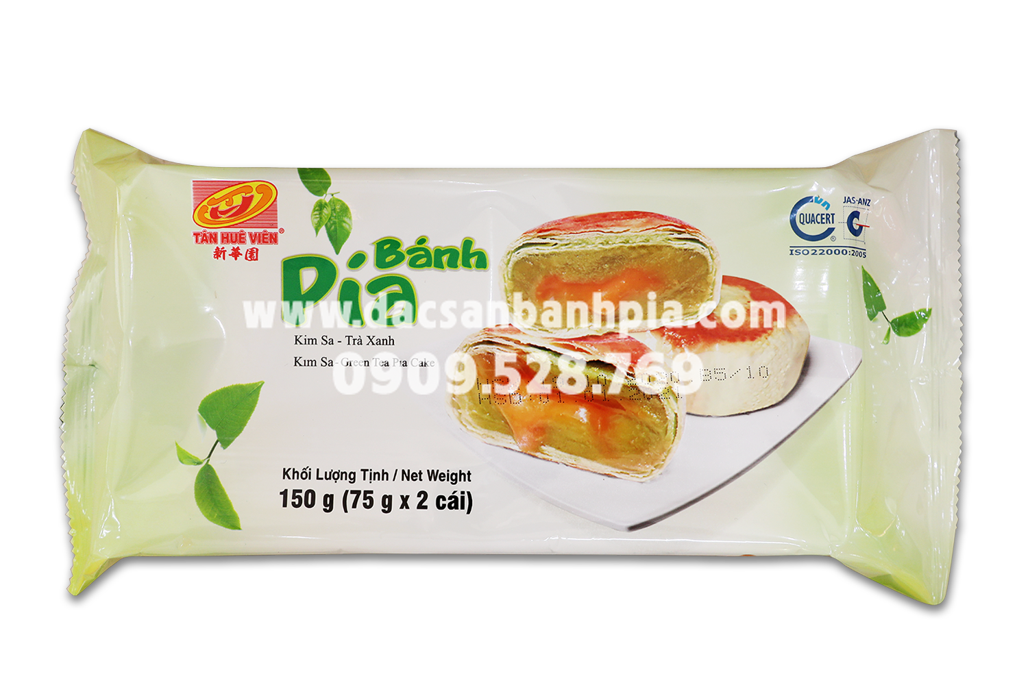 Bạn rất thích matcha, thích vị thanh mát của trà xanh, ăn bất cứ gì mà có vị trà xanh bạn đều rất hài lòng, vậy thì tại sao không nhâm nhi một chén trà với chiếc bánh pía kim sa vị trà xanh này của Tân Huê Viên. Hương vị lá trà thanh mát cùng trứng muối tan chảy vừa béo vừa ngậy là sự hấp dẫn rất lớn đối với người dùng. Bánh được sản xuất với quy cách 150 gram và được đóng gói trong túi gồm hai chiếc bánh có bao bì riêng biệt giúp bảo quản trong thời gian lâu hơn. Đây là một sự lựa chọn mới cho thực khách để thưởng thức hoặc để làm quà biếu rất hợp lý.