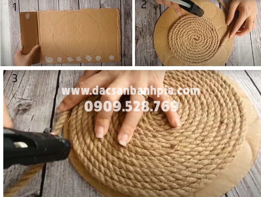 – Bước 1: Cắt miếng bìa cứng thành hình hình tròn có đường kính khoảng 20 – 25cm. Tiếp đến, bạn cuộn tròn dây thừng thành nhiều vòng và dùng súng bắn keo để cố định vòng dây thường với miếng bìa.